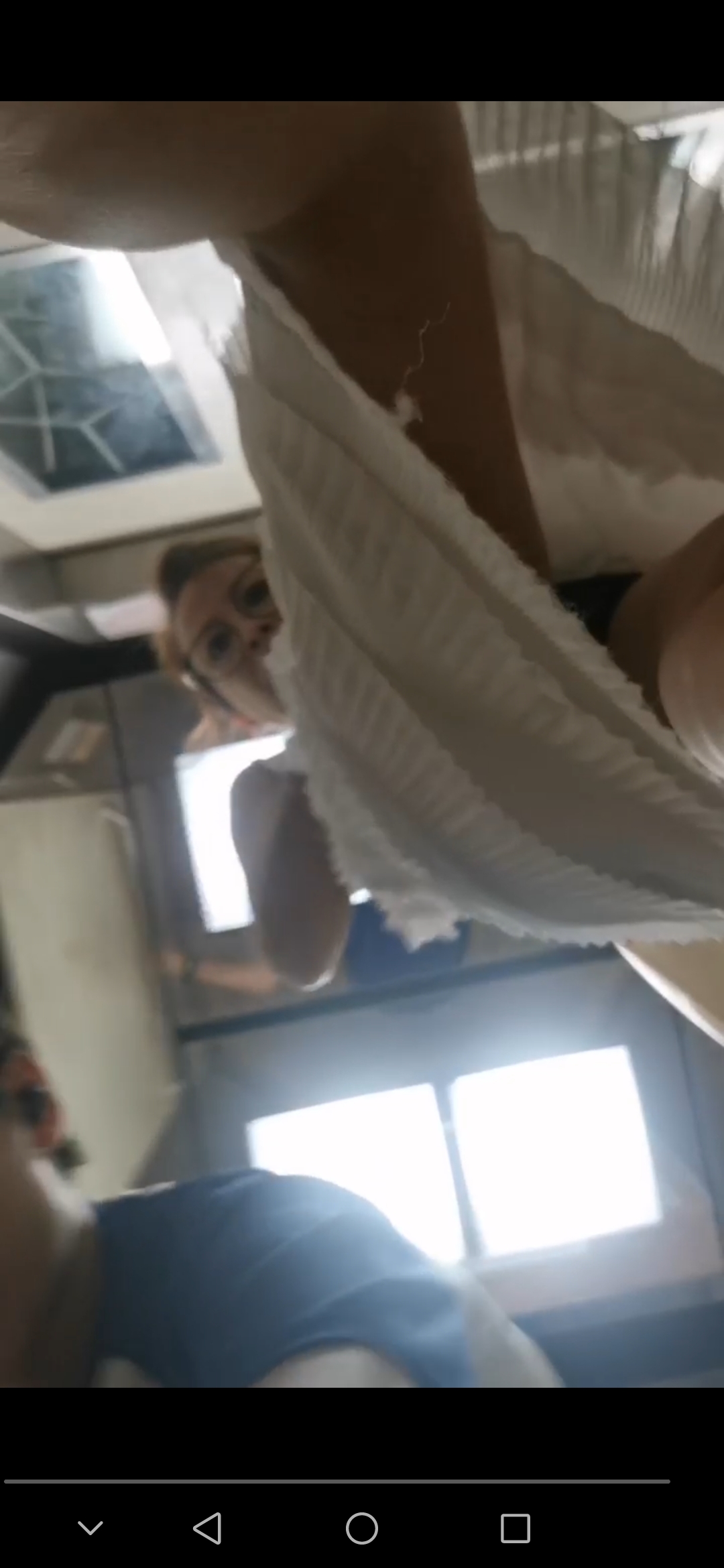 Lady wearing white skirt gets upskirt filmed and steps on phone while walking out the lift and spots camera facing up from her skirt and almost catch her panties being filmed